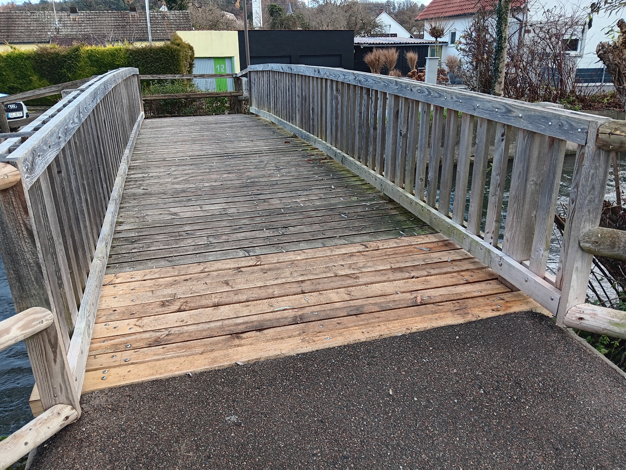 Die Abstände der Holzbohlen auf der Fußgängerbrücke über den Mühlbach im Bereich Josef-Roth-Straße / Bachstraße wurden durch den Bauhof verringert. Dadurch ist eine sichere und komfortable Überquerung gewährleistet.
