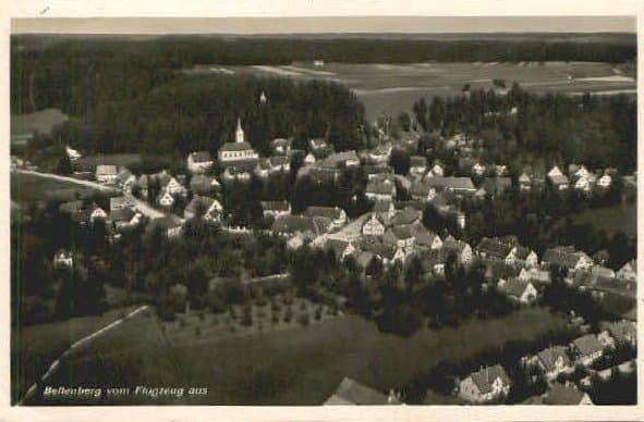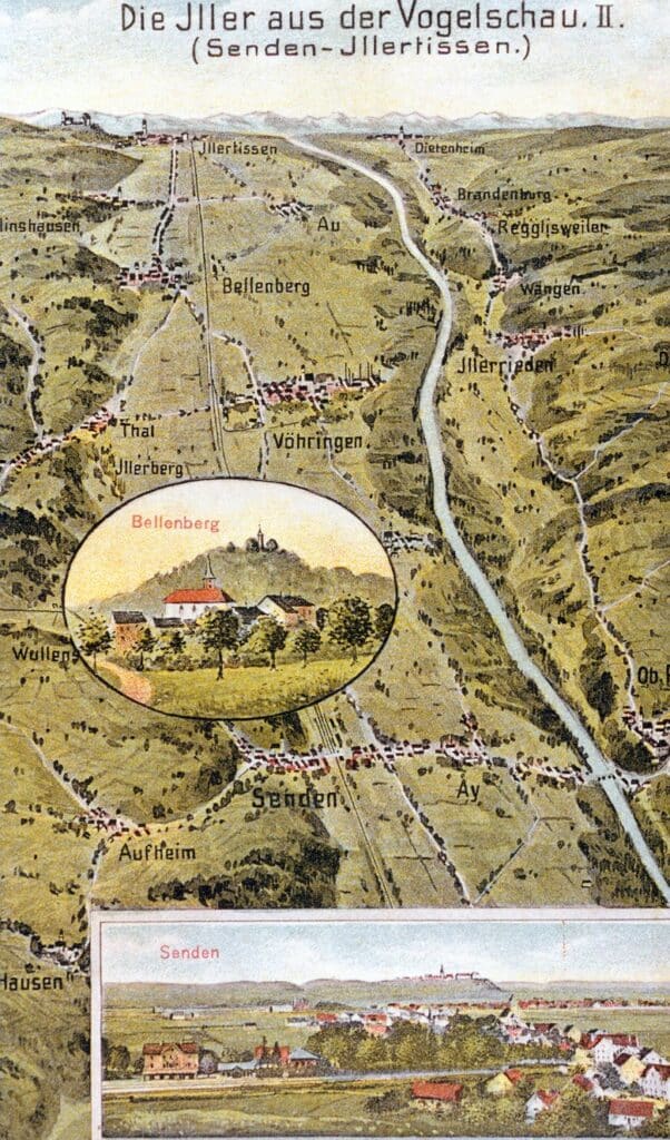 Eine Postkartenansicht des Unteren Illertals aus dem Jahr 1912 zeigt, wie sich die Siedlungstätigkeit in Bellenberg um die Kirche St. Peter und Paul, die Bauerngasse und die Halde konzentriert. Auch die Staatsstraße wird in Richtung Süden und Norden von Häusern gesäumt. Westlich der Bahnstrecke entlang des Altenstadter Kanals befinden sich die Mühlen. Bis zum Bau des Illerkanals 1917 war dieser Bereich immer wieder von Überflutungen aufgrund der Illerhochwässer betroffen.