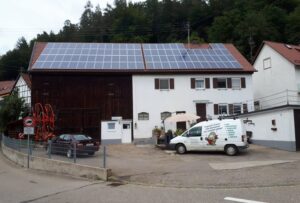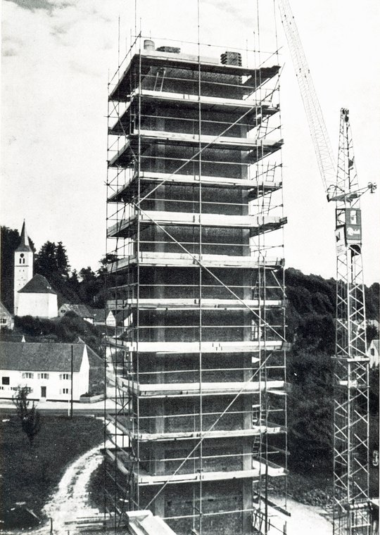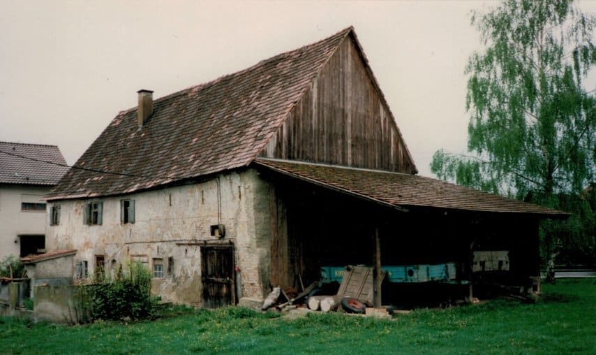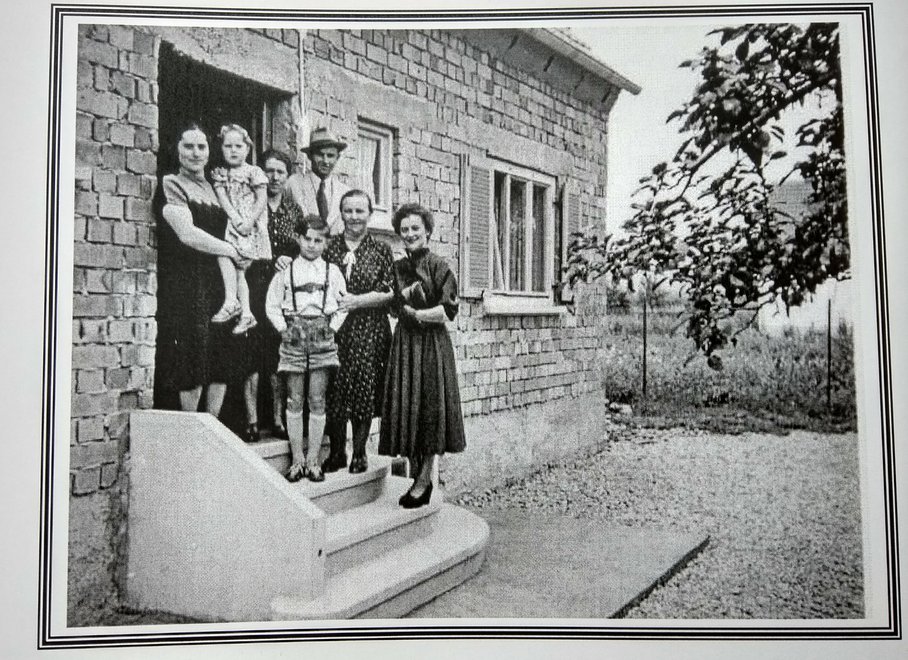 „Durch unseren Fleiß, unsere Tüchtigkeit und Sparsamkeit konnten wir schon 1952/53 ein eigenes Haus bauen. Nicht vorhandene finanzielle Mittel glichen wir durch sehr viel Eigenleistung aus. Vom Schreinermeister Georg Bretzel konnten wir einen kleinen Streifen Land erwerben. Wir machten praktisch alles selber. Eine Stromleitung, die ich vom Konle-Haus zur Baustelle legte, ermöglichte uns ein Arbeiten bei Nacht, denn das Tageslicht reichte oft nicht aus, um die viele Arbeit fertig zu bringen. Bis spät in die Nacht verbrachte ich auf der Baustelle. Die Nächte waren kurz und tagsüber musste ich bei Wieland meinen Mann stehen.“