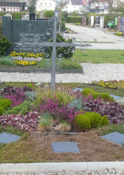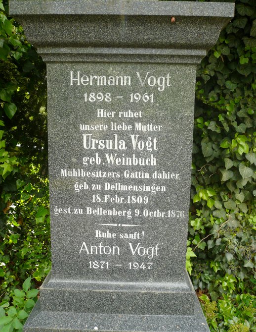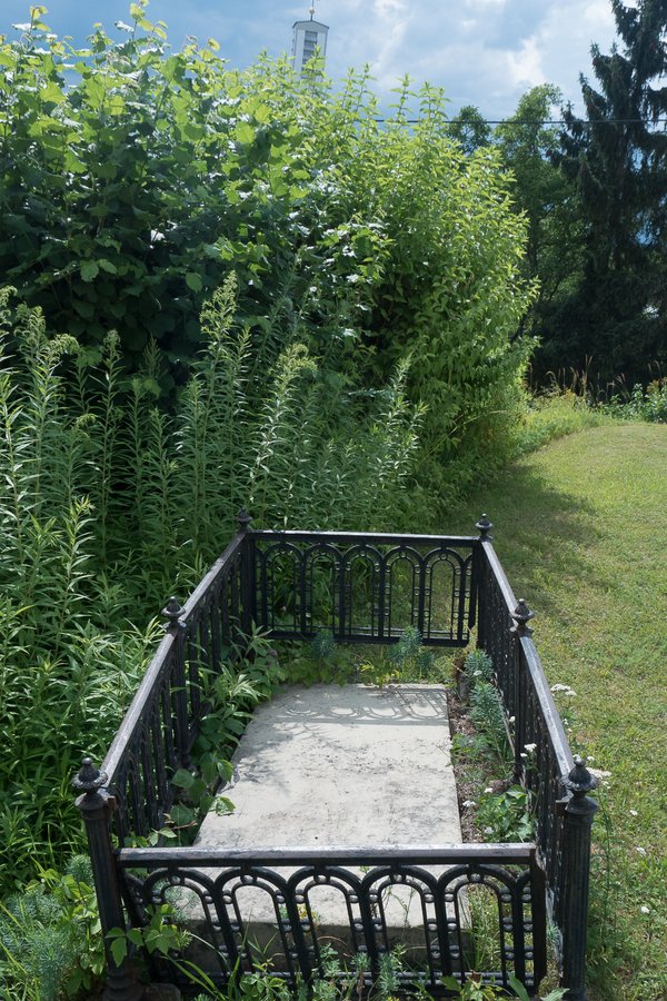 Der Friedhof wurde also verlegt und vergrößert. Ein letztes Grab gibt es noch auf dem ursprünglichen Friedhofsgelände der alten Kirche. Die Ruhestätte besteht aus einem verwittertem Sandstein und einem brüchigem, schmiedeeisernen Gitter als Umfassung. Heutzutage tut man sich schwer, etwas zu entziffern. Wind und Wetter haben die erste Sandsteinschicht abgetragen und nur besonders tief eingravierte Buchstaben sind bruchstückhaft erkennbar. 1963 konnte man, laut Bellenberger Chronik, noch den Namen Sabina M… entziffern, mehr war selbst vor 54 Jahren nicht drin. Weiteres Wissen um das Grab war verloren gegangen. Wer also liegt unter diesem schweren Stein begraben?