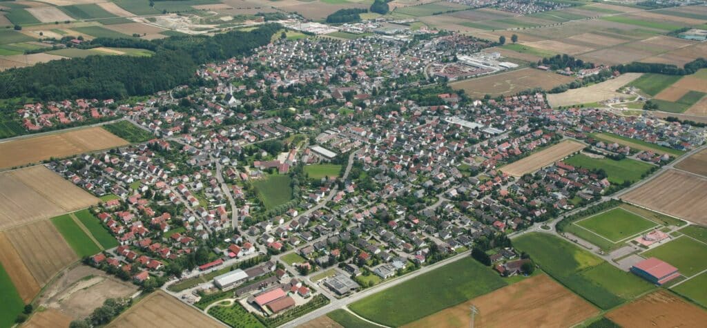 Luftansicht der Gemeinde Bellenberg aus dem Jahr 2007. 2007 hat die Gemeinde im Wesentlichen ihre derzeitige Ausdehnung erreicht. Noch unerschlossen ist das heutige Neubaugebiet Biberau.