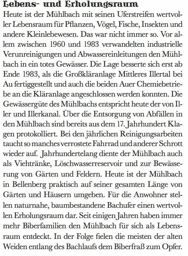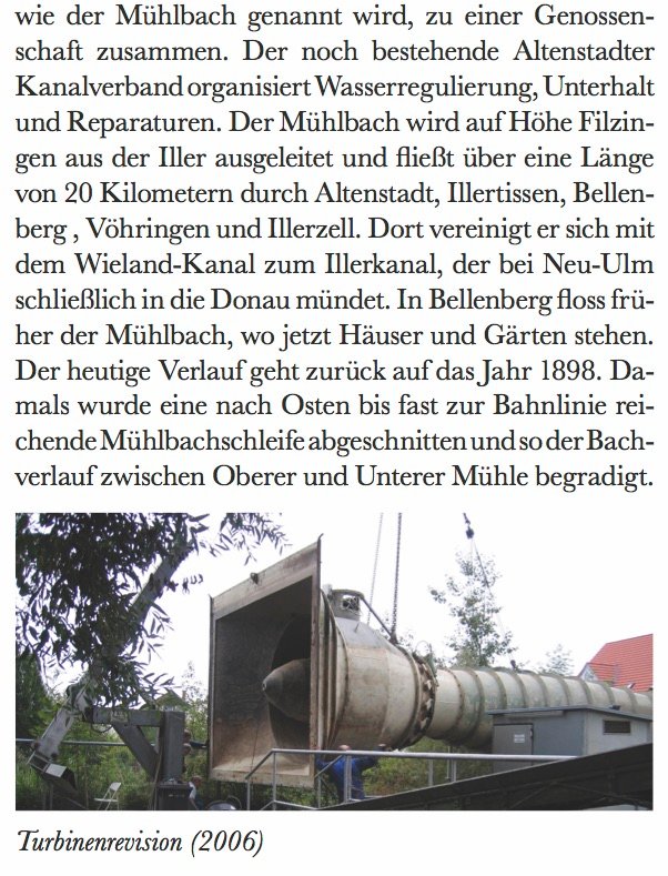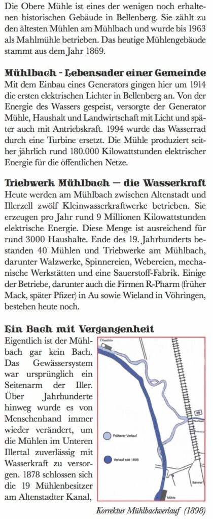 Der Mühlbach in Bellenberg ist Teil des Altenstädter Kanals. Auf Höhe Filzingen aus der Iller ausgeleitet, fließt der Mühlbach durch die Orte Altenstadt, Illertissen, Au, Bellenberg , Vöhringen und Illerzell. Dort vereinigt er sich mit dem Wieland-Kanal zum Illerkanal, der bei Neu-Ulm in die Donau mündet.