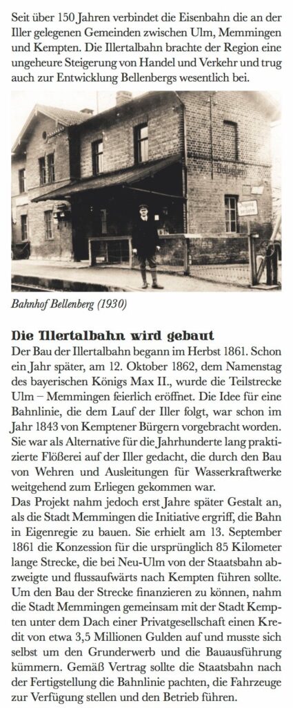 Wir sind in Vöhringen. Auch hier donnerten die Böller, Musik erscholl. Am unfertigen, doch festlich herausgeputzten Bahnhof standen die Vöhringer. Aussteigen, Grüßen und wieder Einsteigen, und Hurrah vorwärts! Die Bahn rückt immer näher an die Iller. Hören wir nicht schon wieder den Donner der Freudenböller? Dampfroß halt an, hier mußt Du ausschneufen, denn hier ist Illertissen. Auf dem Bahnhof war Jubel und Leben. Der Sängerkranz von Illertissen hatte Recht, wenn er das Lied anstimmte: Heil uns, die Gottheit ist gewogen! Es war ein schöner Anblick, die Volksmenge mit Fahnen und Standarten, der festlich geschmückte Bahnhof, der improvisierte Tannenweg nach dem nahen Ort und drüber der Berg mit dem ansehnlichen Schloß. Im Bahnhof selbst war ein Frühstückstisch aufgestellt, wo zu den vortrefflichen Leckerbissen das berühmte Illertissener Bier in bester Qualität floß. Die Pause ging nur zu schnell vorüber. Auf dem Dache des Bahnhofsgebäudes in Altenstadt war eine schwarz-rot-goldene Flagge aufgerichtet. Kellmünz, die nächste Station, bezeugt schon im Namen, wie uralt der Ort sei. Schon vor 1 900 Jahren erbauten die Römer hier als Illergrenzveste ein Kastell und nannten es in Erinnerung an einen Hügel, auf dem Rom erbaut war, Coelius mons, welches in Kölmons und Kellmünz sich verändert hat. Fellheim und Heimertingen sind die beiden letzten Stationen vor Memmingen. Auch auf ihren Bahnhöfen wiederhote sich der Jubel und das „Heil unserm König, Heil!“ und Böllersalven und Hurrah und was noch alles dazu gehört.