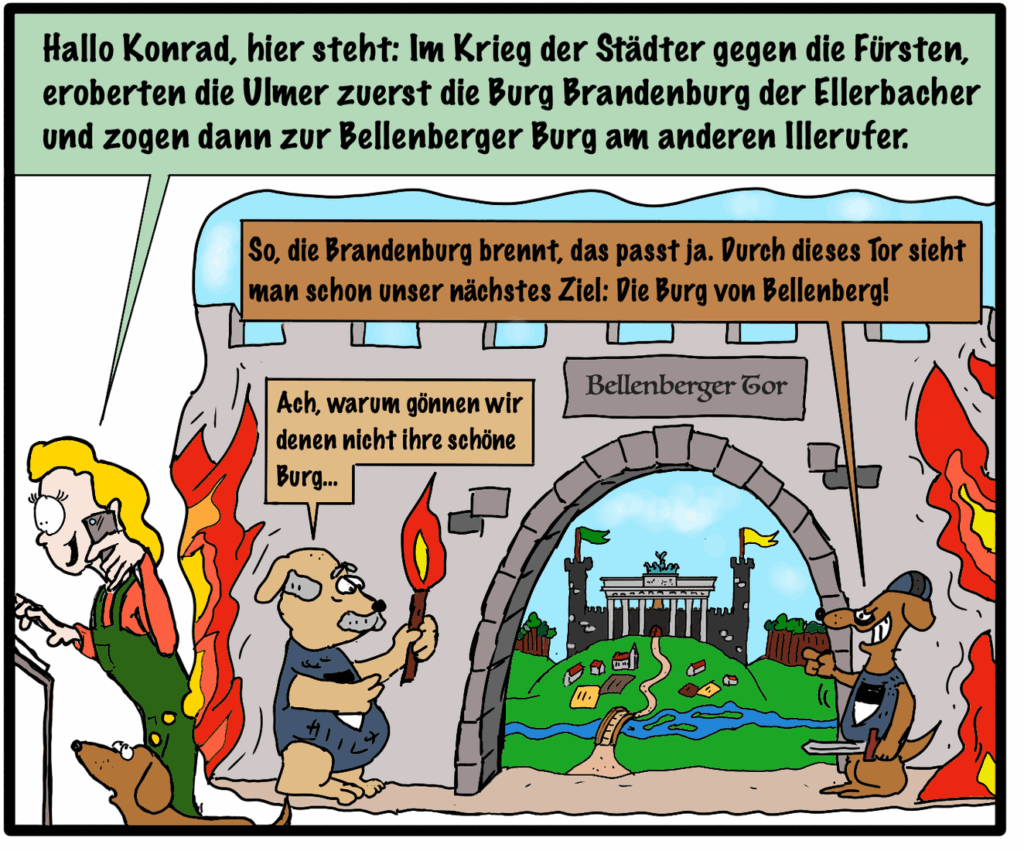 Man kann unbedingt davon ausgehen, dass die Gefangenen den Ulmern mehr oder weniger freiwillig Auskunft über die Verteidigungsstärke der Bellenberger Burg gegeben haben. Der Lehensherr war schließlich der gleiche. Die Ulmer beschließen also, am selben Tag auch noch die Bellenberger Burg zu erobern.