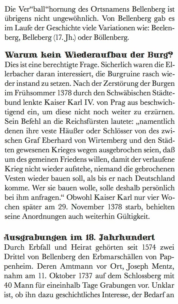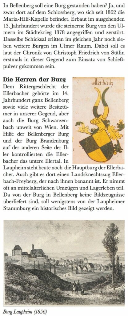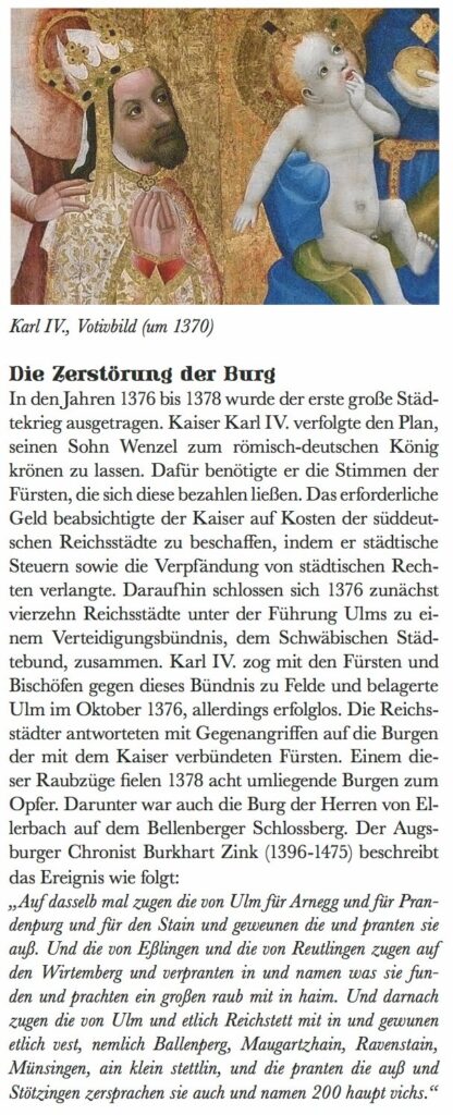 Hier taucht Bellenbergs „vesty“, also Burg, das erste Mal auf – einen Tag nach ihrer Zerstörung. Eine weitere Beschreibung der Ulmer Kriegszüge findet sich in der Augsburger Chronik.