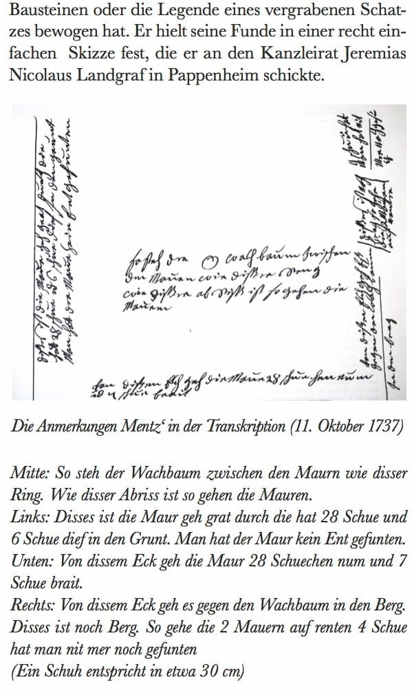 Im Jahr 1737 wird dieser auf dem Schlossberg, drei Meter tief in der Erde, mehrere Wagenladungen voll Roggen, Dinkel, Weizen und Hafer finden. Alles verbrannt. Er stellt auch fest, dass die Burg über eine mehr als 2 Meter dicke steinerne Mauer verfügte und er gelangt, trotz mehrtägiger Grabungen nicht auf den Grund dieser Mauern.