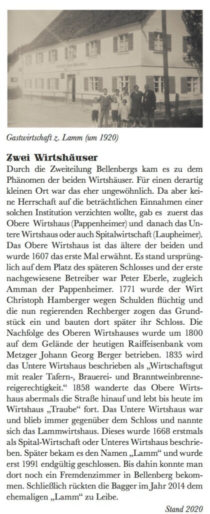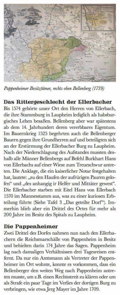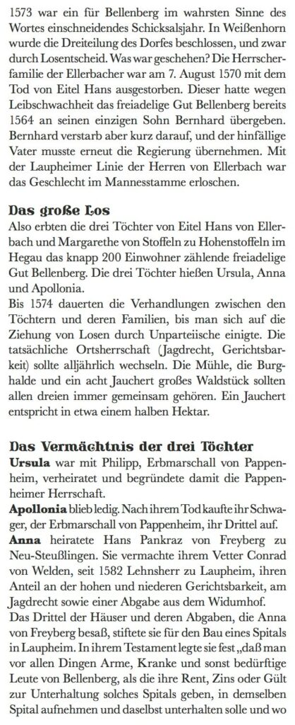 1570 sind die Herren von Bellenberg, das Rittergeschlecht der Ellerbacher, im Mannesstamm ausgestorben. „Nur“ drei Töchter tragen jetzt noch das adlige Blut in sich. Das bedeutet, der Stammsitz der Ellerbacher, Laupheim samt Burg, fällt als Reichslehen zurück an den Kaiser. Das Dorf Bellenberg allerdings ist ein freiadliges Gut, also reichsunmittelbar und kann somit im Besitz der drei Erbinnen verbleiben.