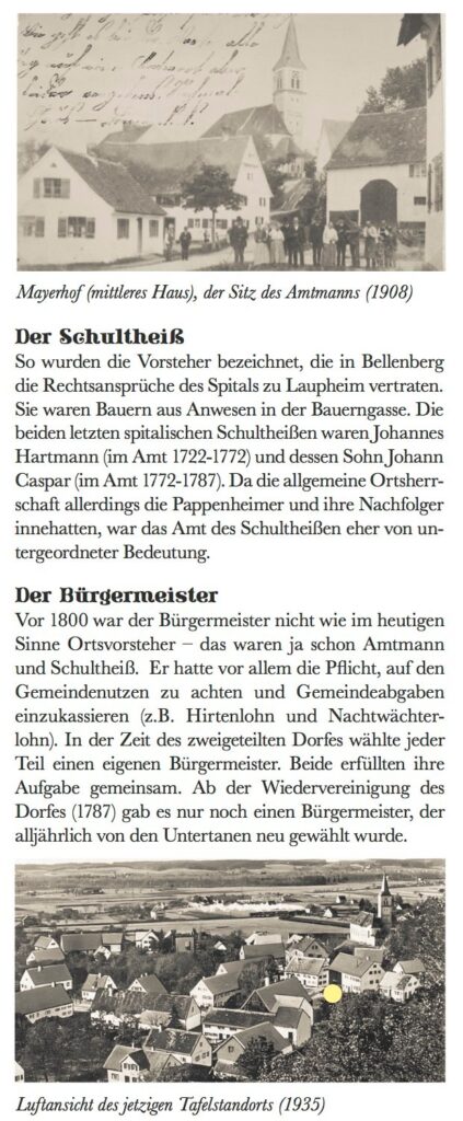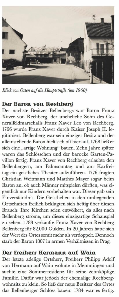 Das Dorf besteht aus 71 Anwesen, wovon 63 dem 60-jährigen Baron Philipp Adolf von Herman gehören. Gut zehn Jahre zuvor hatte dieser den Rechberger Anteil von Bellenberg erworben, ein nagelneues Schloss bauen lassen und schließlich auch noch den Laupheimschen Besitz dazugekauft. Bellenberg war nach über 200 Jahren also wieder so gut wie vereint.