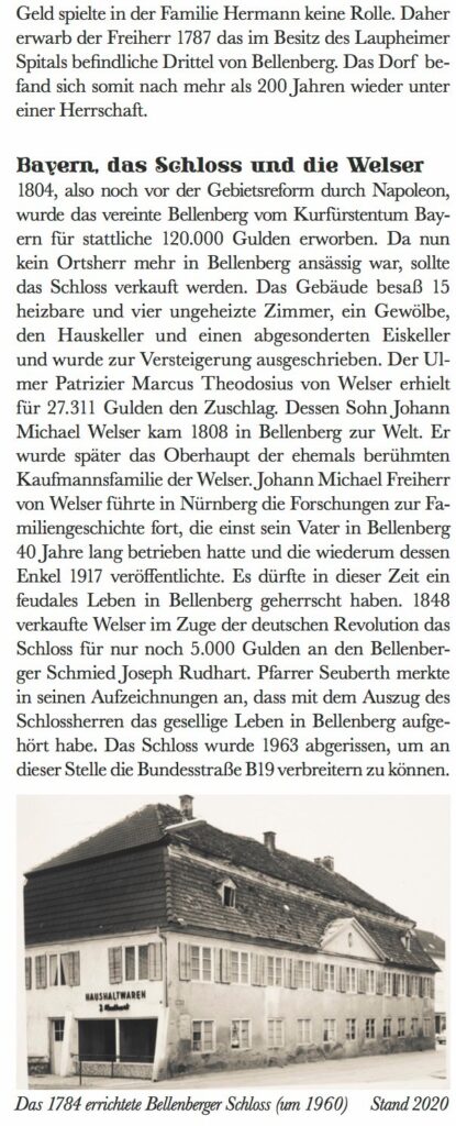 Der Kurfürst von Bayern hatte 1804 dem Freiherren von Hermann ganz Bellenberg abgekauft. Für das Schloss bestand kein Bedarf, denn eine Verwaltung vor Ort war nicht mehr vorgesehen. In mehreren Zeitungen fand sich alsbald die Anzeige: Schloss in Bellenberg zum Verkauf angeboten. Ein Baumwollfabrikant und sogar ein Kirchendiener aus dem Vatikan sollen unter den Interessenten gewesen sein. Den Zuschlag für 27.311 Gulden und 8 ¼ Kreuzer erhielt allerdings der Ulmer Verwaltungsrat Markus Theodosius III. Welser. Welsers(Jahreseinkommen: 800 Gulden.