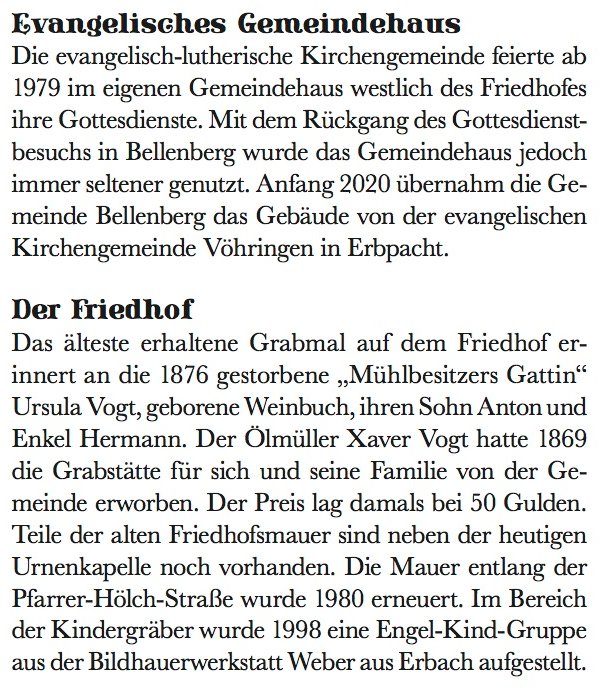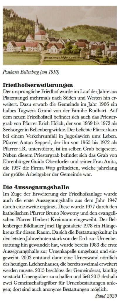 Christliche Friedhöfe gruppieren sich seit alters her um Kirchen. Die Verstorbenen sollen den darinnen enthaltenen Reliquien möglichst nahe sein. Wechselte ein Friedhof einmal seinen angestammten Platz, dann lag das entweder an der Angst vor den sogenannten „mephitischen“ Schwaden der Toten (Mefitis: italische Göttin der übelriechenden Dünste) mitten im Ort, oder daran, dass der Friedhof zu klein geworden war und einfach eine ungünstige Lage besaß, wie im Falle Bellenbergs. Der Hügel behielt nicht immer, was er bekam und so soll es mehrfach vorgekommen sein, dass die begrabenen Bellenberger bei starken Regenfällen knochenweise wieder ans Tageslicht rutschten.