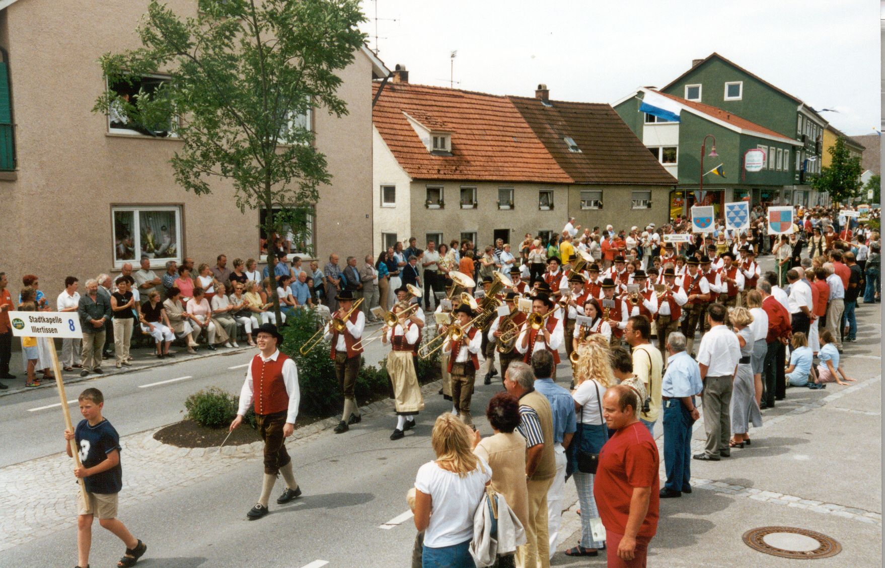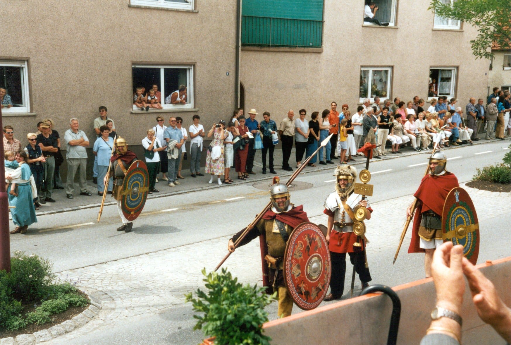 Wir sind in Vöhringen. Auch hier donnerten die Böller, Musik erscholl. Am unfertigen, doch festlich herausgeputzten Bahnhof standen die Vöhringer. Aussteigen, Grüßen und wieder Einsteigen, und Hurrah vorwärts! Die Bahn rückt immer näher an die Iller. Hören wir nicht schon wieder den Donner der Freudenböller? Dampfroß halt an, hier mußt Du ausschneufen, denn hier ist Illertissen. Auf dem Bahnhof war Jubel und Leben. Der Sängerkranz von Illertissen hatte Recht, wenn er das Lied anstimmte: Heil uns, die Gottheit ist gewogen! Es war ein schöner Anblick, die Volksmenge mit Fahnen und Standarten, der festlich geschmückte Bahnhof, der improvisierte Tannenweg nach dem nahen Ort und drüber der Berg mit dem ansehnlichen Schloß. Im Bahnhof selbst war ein Frühstückstisch aufgestellt, wo zu den vortrefflichen Leckerbissen das berühmte Illertissener Bier in bester Qualität floß. Die Pause ging nur zu schnell vorüber. Auf dem Dache des Bahnhofsgebäudes in Altenstadt war eine schwarz-rot-goldene Flagge aufgerichtet. Kellmünz, die nächste Station, bezeugt schon im Namen, wie uralt der Ort sei. Schon vor 1 900 Jahren erbauten die Römer hier als Illergrenzveste ein Kastell und nannten es in Erinnerung an einen Hügel, auf dem Rom erbaut war, Coelius mons, welches in Kölmons und Kellmünz sich verändert hat. Fellheim und Heimertingen sind die beiden letzten Stationen vor Memmingen. Auch auf ihren Bahnhöfen wiederhote sich der Jubel und das „Heil unserm König, Heil!“ und Böllersalven und Hurrah und was noch alles dazu gehört.